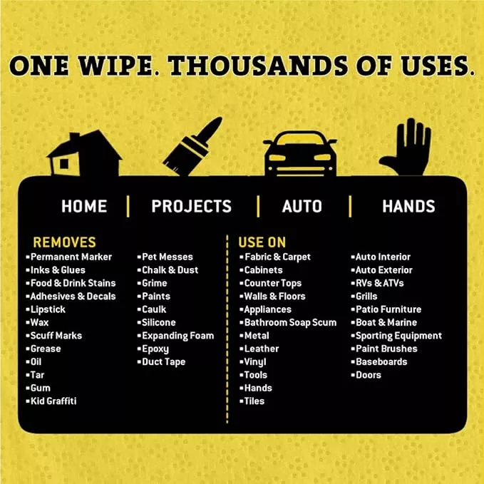 Pembersihan yang kuat: Dirancang untuk menghilangkan noda yang keras, menghilangkan minyak, tar, tinta, cat, spidol permanen, lilin, lecet, lipstik, cat kuku, makanan dan minuman, noda hewan peliharaan dan banyak lagi.